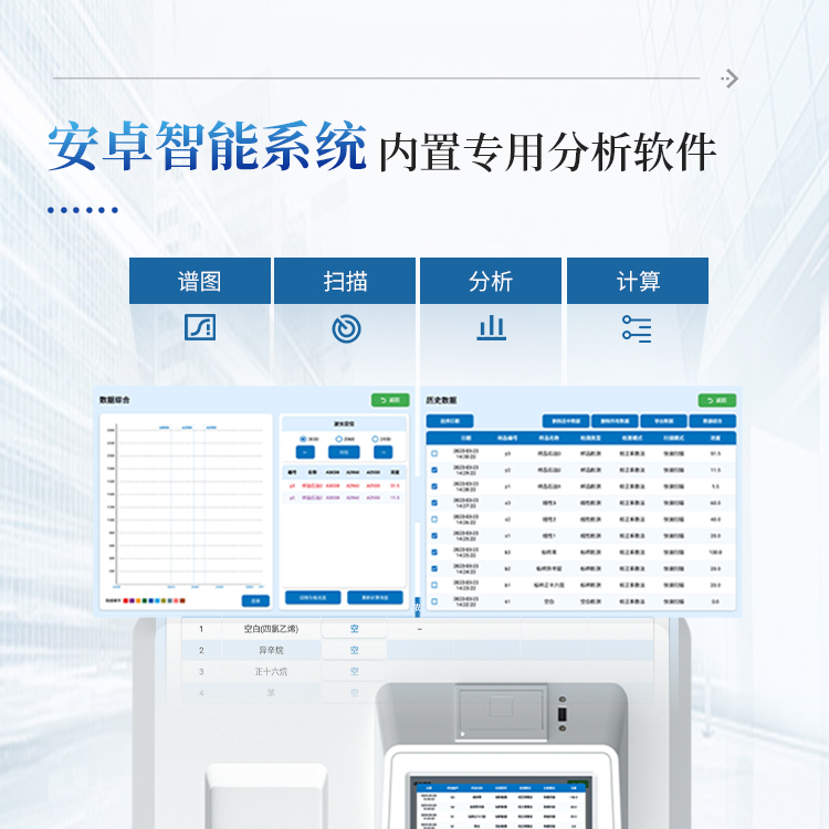 2.仪器采用安卓7.1版本智能操作系统,内置专用测油仪分析软件,集谱图、扫描、分析、计算于一体;